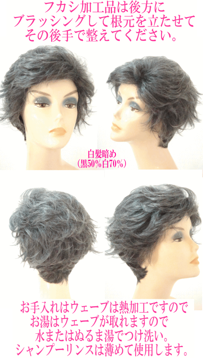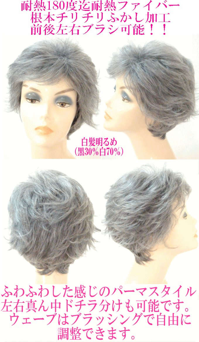 バックスタイルにブラッシング可能です。ミセスフルウィッグ 白髪ウィッグ ソフトウェーブパーマ仕上げ シルバーミセスお勧め【メール便可】/医療用おすすめ 耐熱180度迄ファイバーミセスウィッグ 白髪ウィッグ 白髪かつら